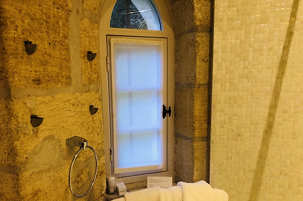 Cette belle chambre de 23 m² dispose d’un lit de 160 x 200 et d’une salle de bain nichée dans une des tours du château, avec douche et vasque. Les toilettes sont indépendantes.